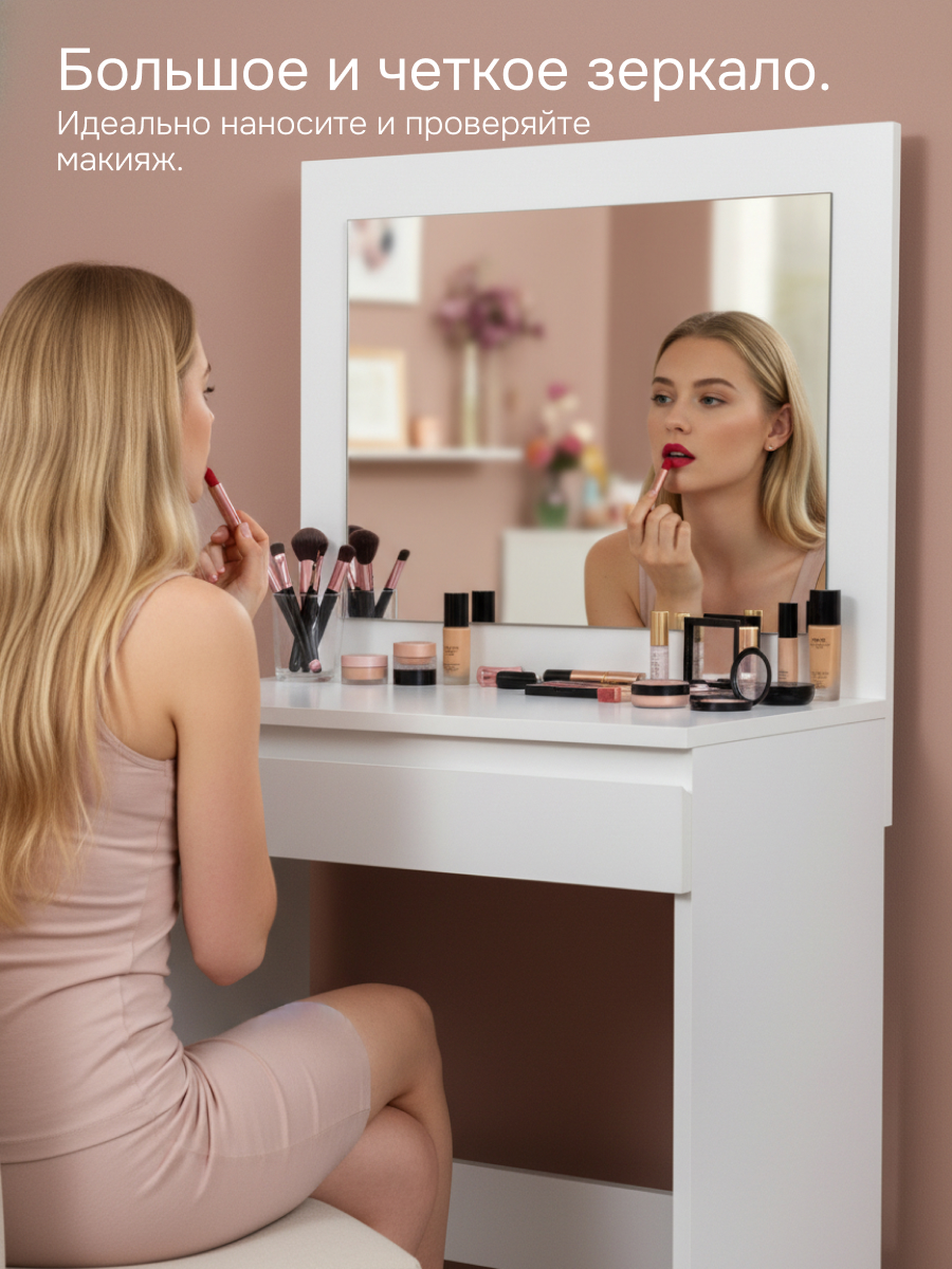 Туалетный столик с зеркалом и ящиком Марм — идеальное решение для создания уюта и комфорта в вашей спальне или ванной комнате. Этот стильный столик от белорусского производителя мебели "Диприз" подойдет для девочки-подростка, фотостудии, квартиры-студии, для визажистов. С его помощью вы сможете удобно хранить свои косметические принадлежности и аксессуары.