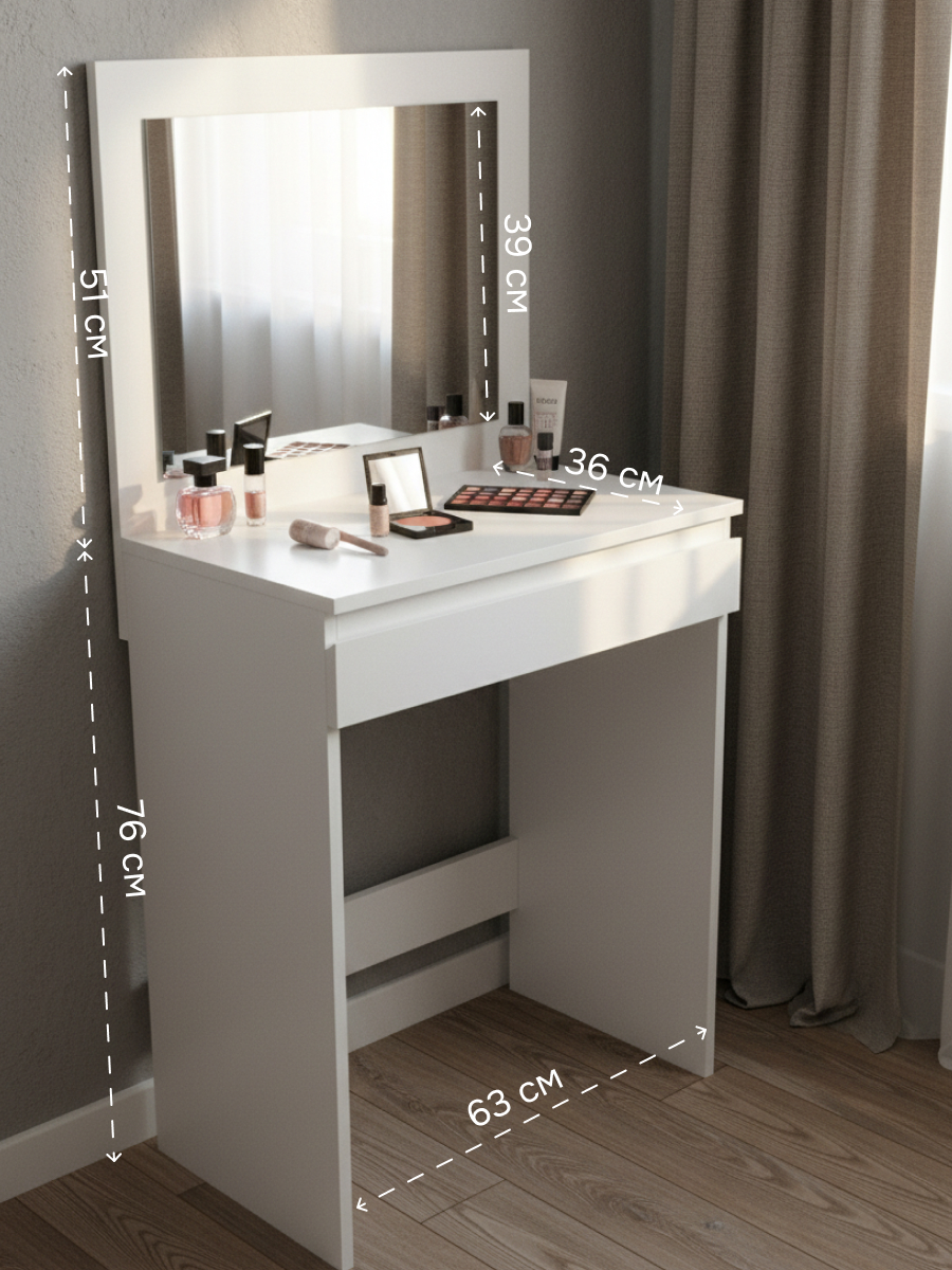 Мы уделяем особое внимание качеству материалов, поэтому вы можете быть уверены в надежности и долговечности этого туалетного столика. Стол изготовлен из экологически чистого ЛДСП 16 мм класса эмиссии E1 (безопасно даже для детей). Он подходит для любого стиля интерьера — от скандинавского до модерна. Перед тем как купить этот столик, подумайте о том, как он может изменить ваше пространство и добавить в него индивидуальности.
