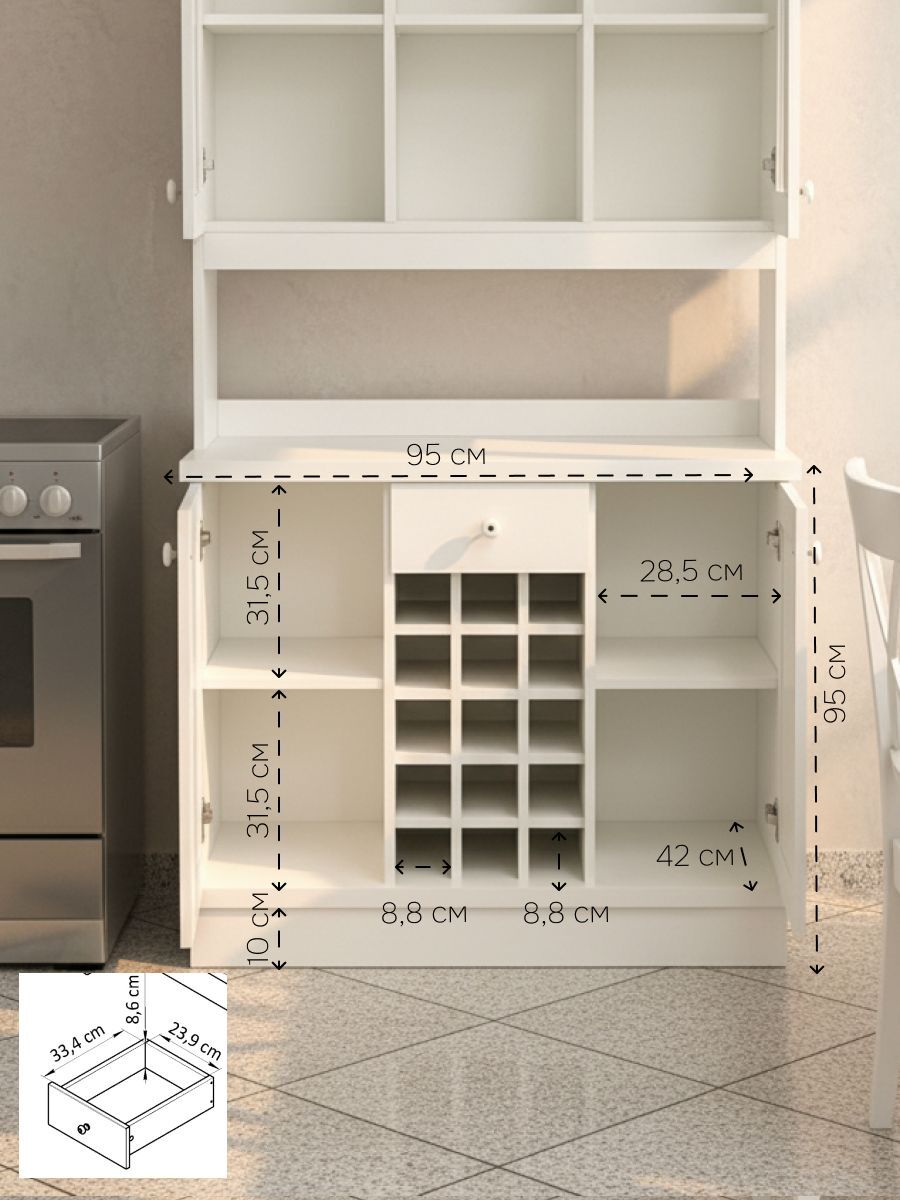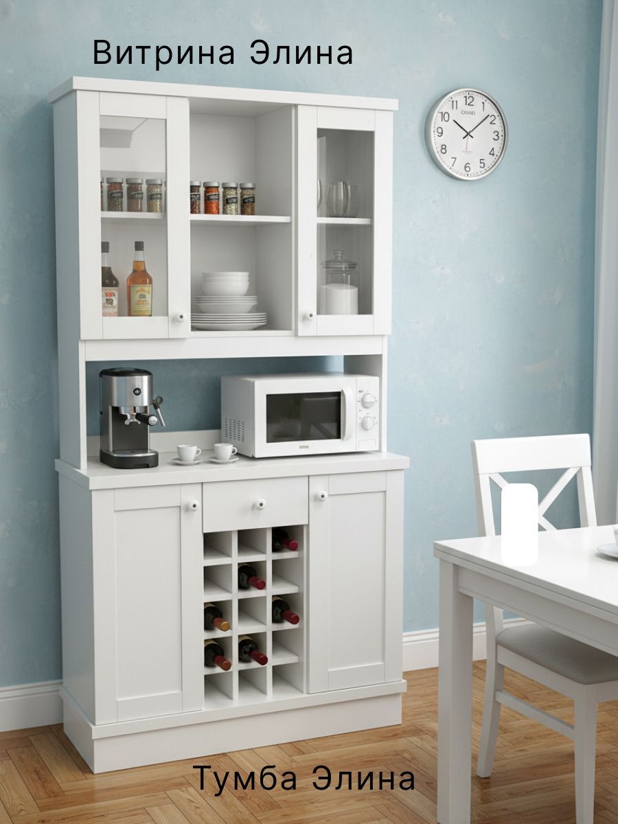 Тумба Эвелина в комбинации с витриной надстройкой представляет собой модульный буфет, который прекрасно подойдет как для кухни, так и для столовой. Тумбу можно приобрести отдельно и использовать ее в любой комнате, где необходимо упорядочить систему хранения. Тумба выполнена из экологичного ЛДСП — материала безопасного и экологически чистого, который обеспечит долговечность и стабильность конструкции.