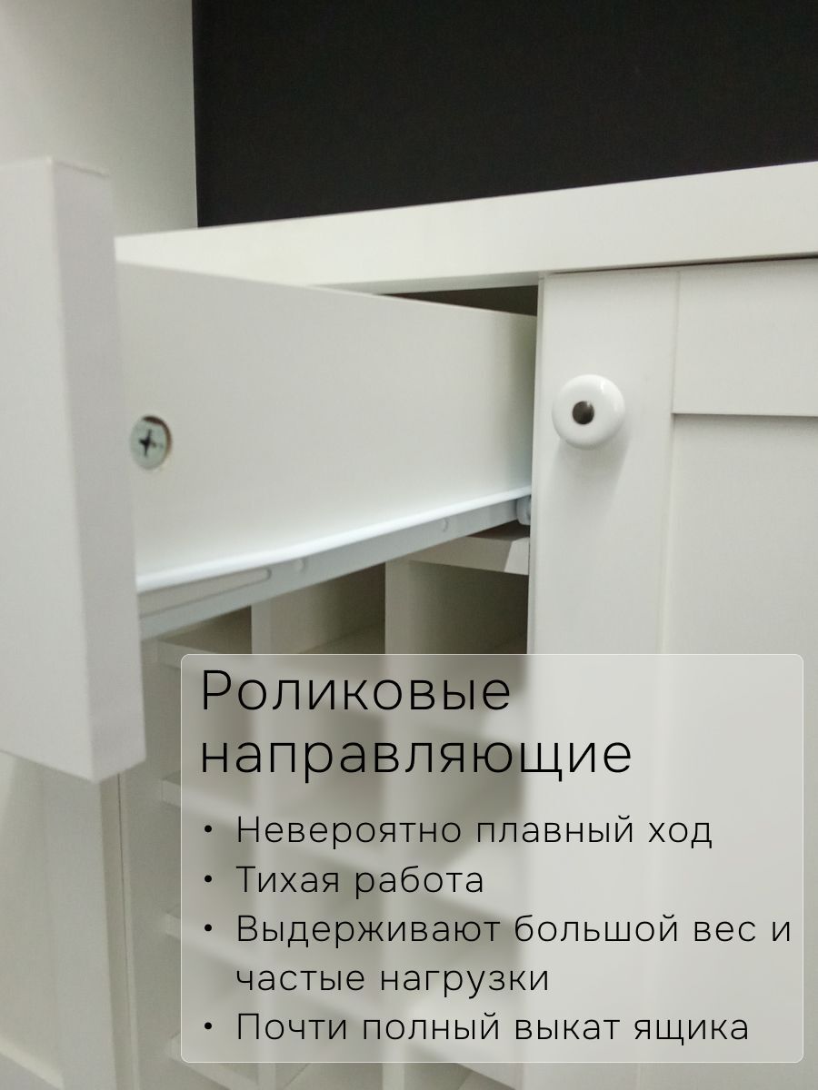 Выдвижной ящик имеет роликовые направляющие, которые обеспечивают плавное и тихое закрытие и прослужат долгое время.