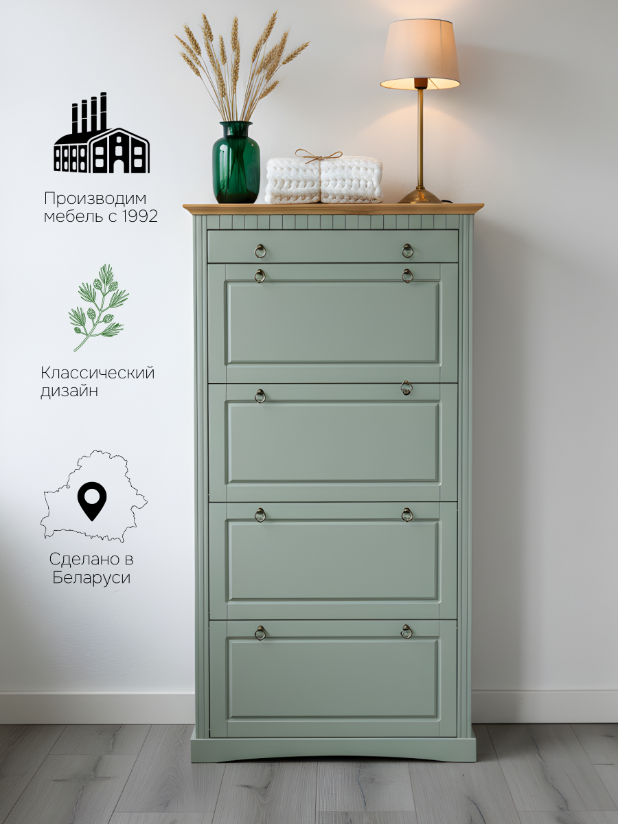 Выполненная из массива сосны, эта тумба для обуви не только предлагает удобное место для хранения обуви и других предметов, но и служит полноценным элементом интерьера прихожей. Благодаря зеленому цвету (за счет покрытия натуральным воском) обувница добавит элегантности и красоты Вашему помещению, сохранит приятный хвойный аромат и полезные свойства дерева. Это обеспечивает не только стойкость к внешним воздействиям, но и подчеркивает естественную красоту массива дерева. Фасад комода для обуви дополнен декоративными резными вставками, которые добавит изысканности в ваше помещение.