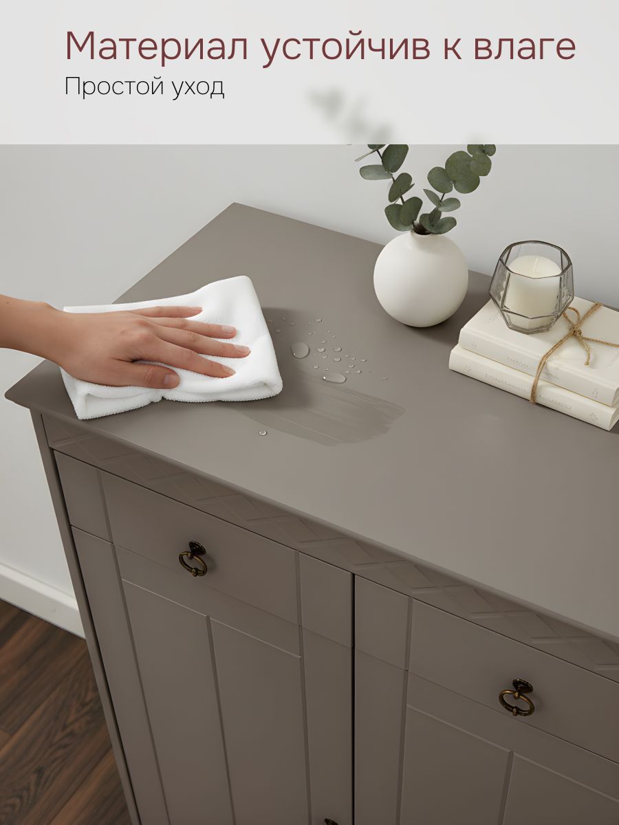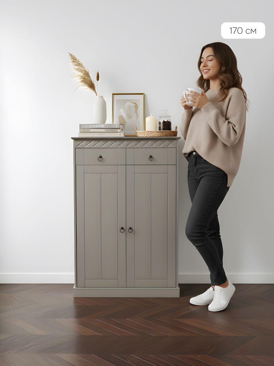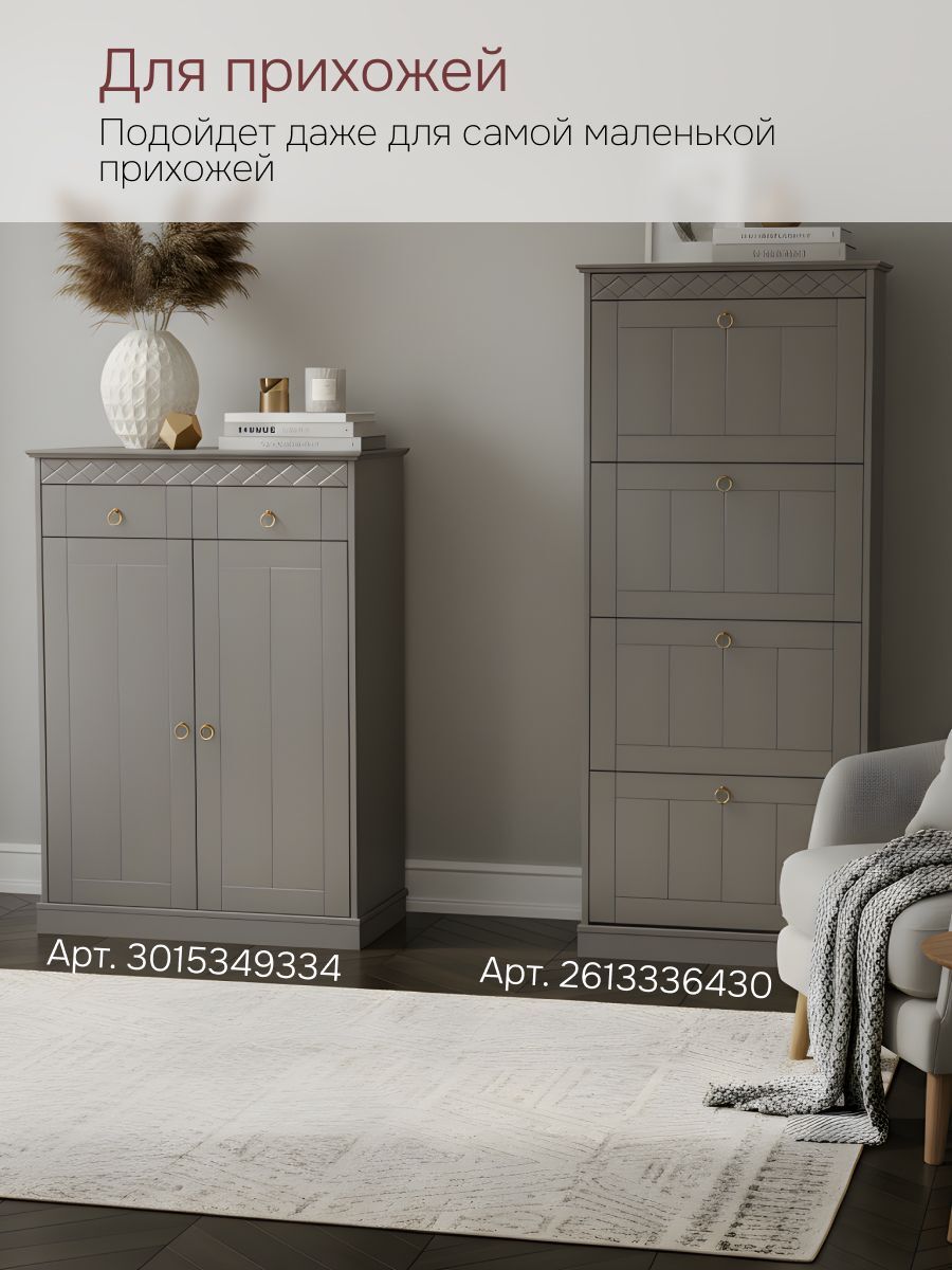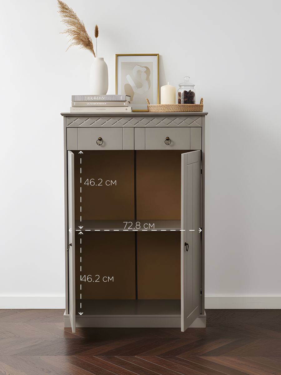 - Дизайн, который впечатляет Уникальные фрезеровки в классическом стиле превращают фасады в художественный элемент. Серый цвет универсален и легко сочетается с любой палитрой вашего интерьера, делая комод стильным акцентом.