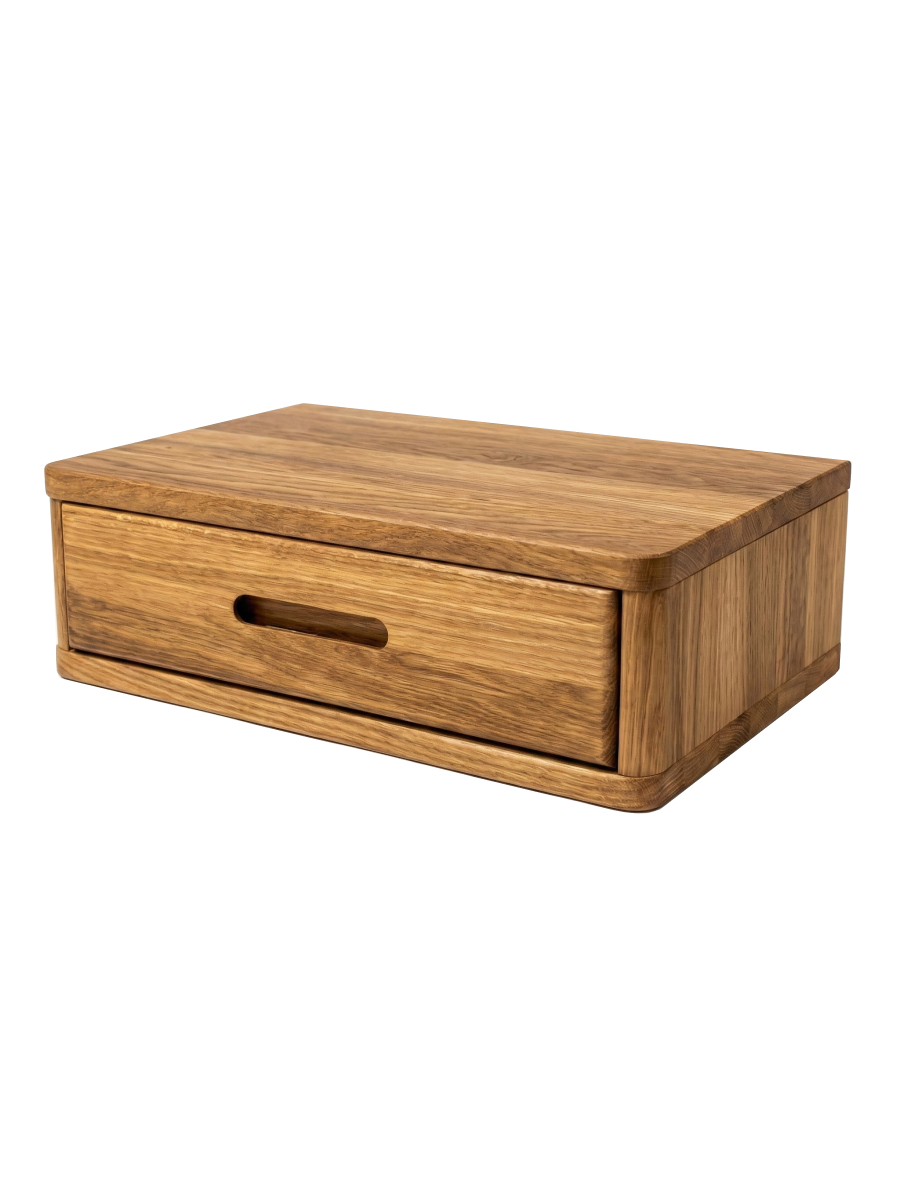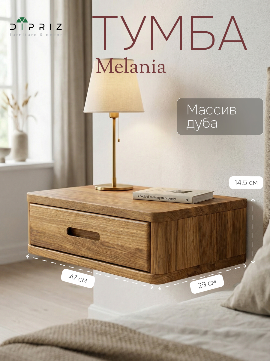 Тумба прикроватная «Мелания» от бренда Dipriz выполнена из натурального массива дуба, что гарантирует долговечность и экологическую безопасность. Её подвесная конструкция создаёт эффект «парящего» элемента интерьера, а компактные размеры идеально подходят для маленьких пространств. Встроенная полочка обеспечивает удобное хранение мелочей или декора.