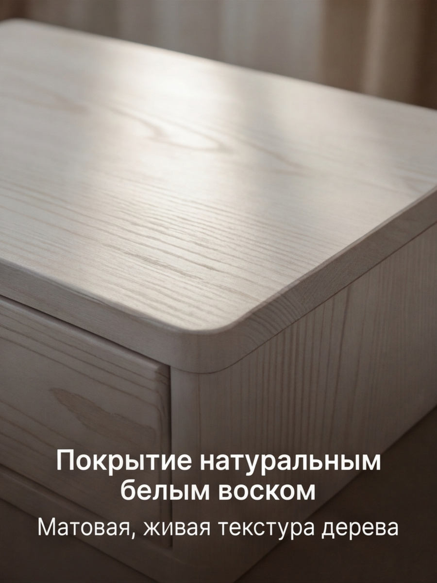 Массив сосны, покрытый гипоаллергенным белым воском, выглядит благородно и современно, подчеркивая минималистичный дизайн с чистыми линиями. Размеры 47х29х45 см позволяют разместить ее даже в тесных помещениях, а максимальная нагрузка 50 кг дает уверенность: лампа, книги, ваза с полевыми цветами или детские сокровища будут стоять стабильно. Встроенный ящик на шариковых направляющих выдвигается бесшумно и плавно — туда легко убрать пульт, косметику, зарядки или игрушки, сохраняя порядок без лишних усилий.